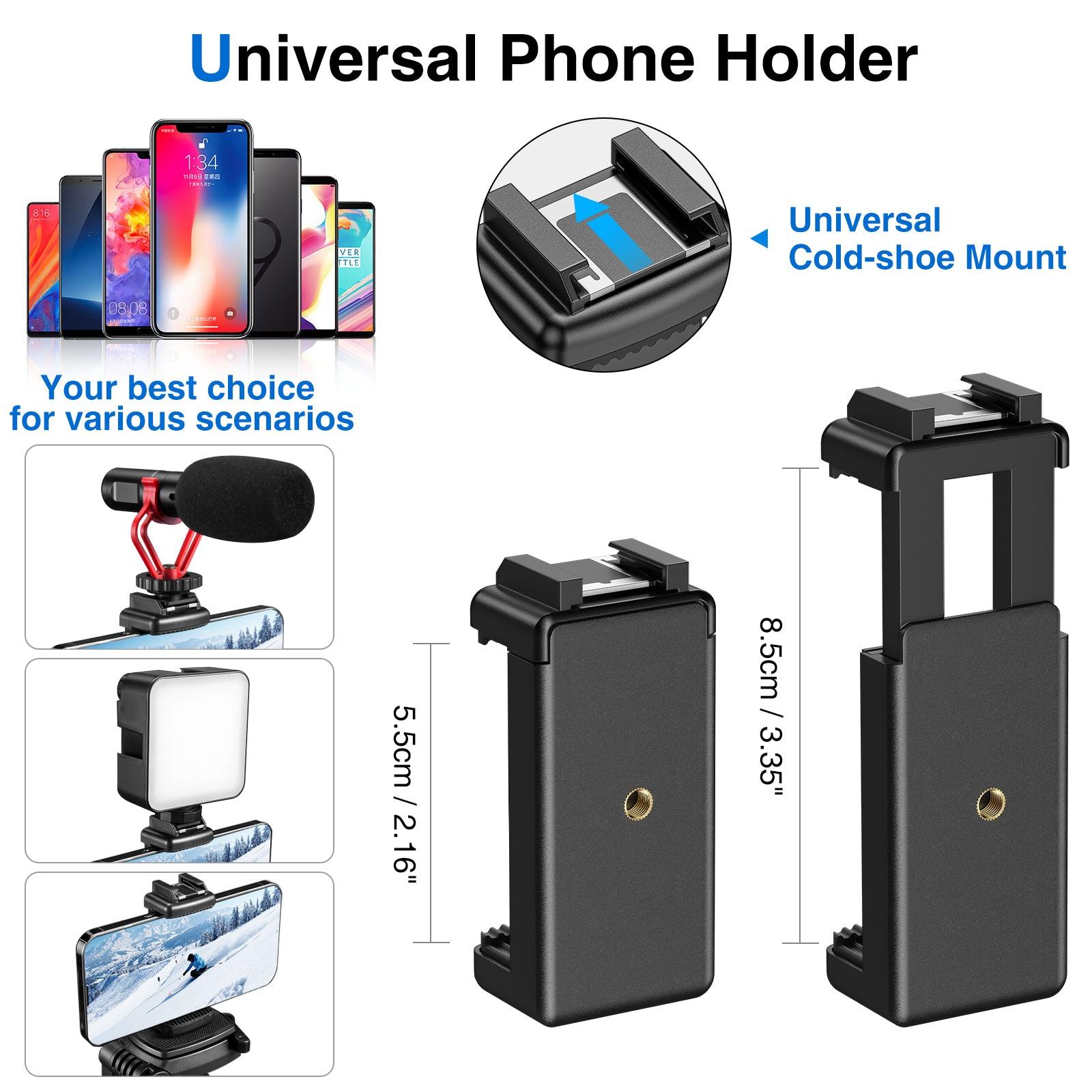 Product includes a phone holder with universal cold-shoe mount, compatible with most smartphones width 55mm(2.16in) to 85mm(3.35in)