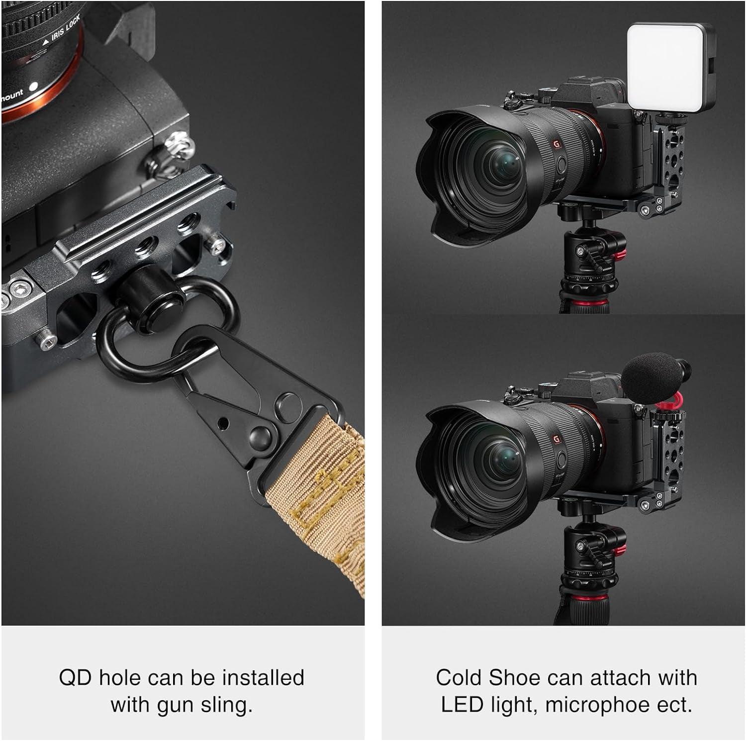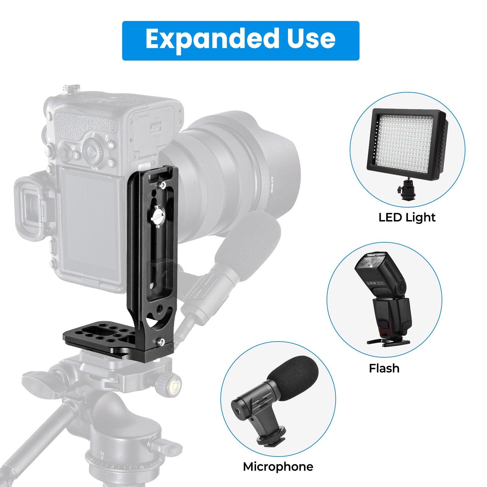 This foldable L bracket can be used for both vertical and horizontal shooting, can quickly switch from 'landscape' to 'portrait', instead of using a ball joint, which needs to keep level. This L bracket has QD Sling Swivels hole,it can be used with QD sling.Very inconvenience. Also it has a cold shoe,can be used with microphone and LED lights.Functional L Bracket.