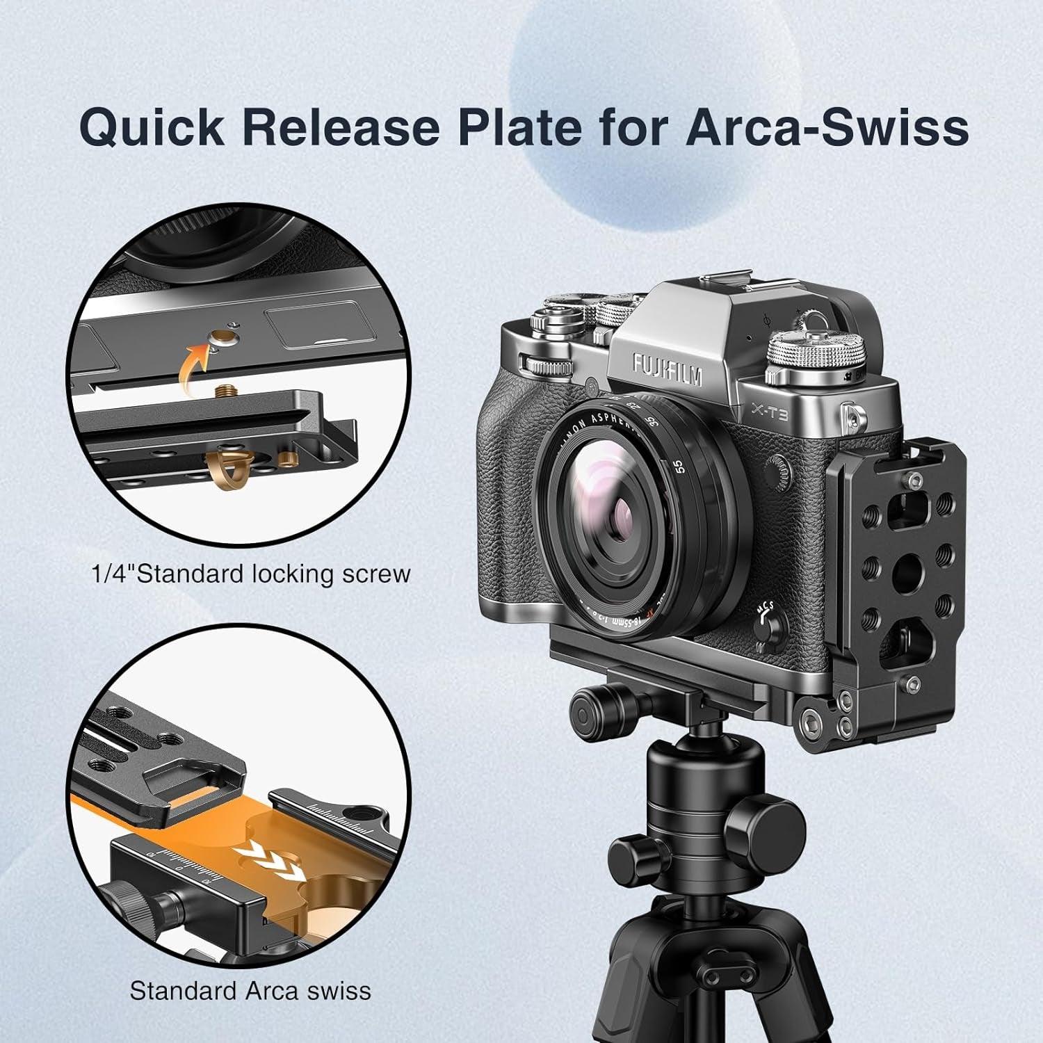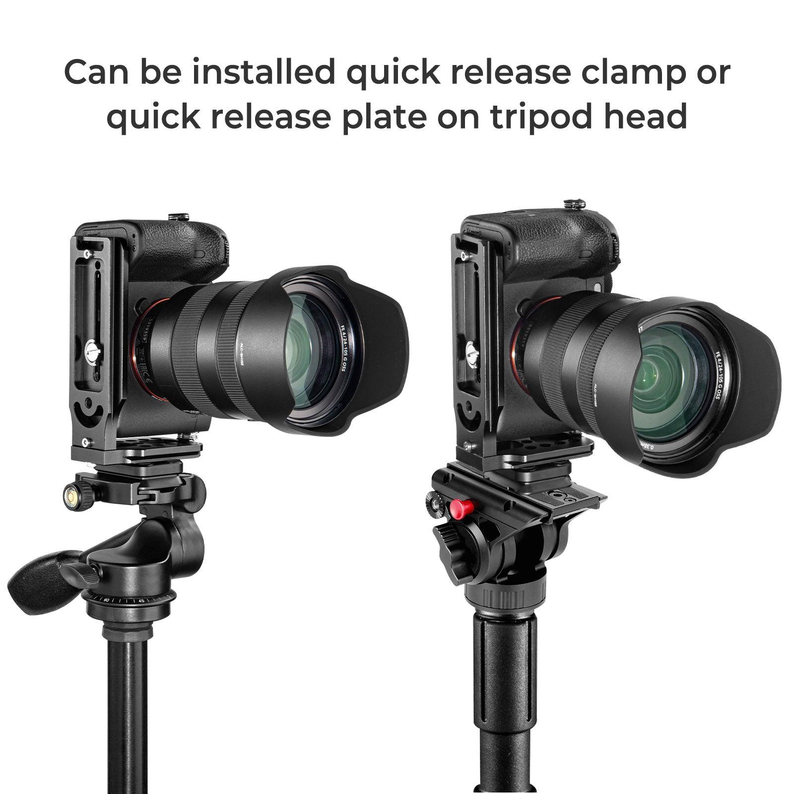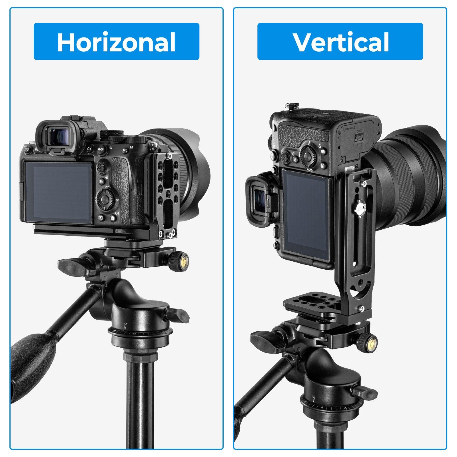 This L bracket camera with mount's Arca Swiss quick-release plate allows for a smooth transition between vertical and horizontal shooting orientations -