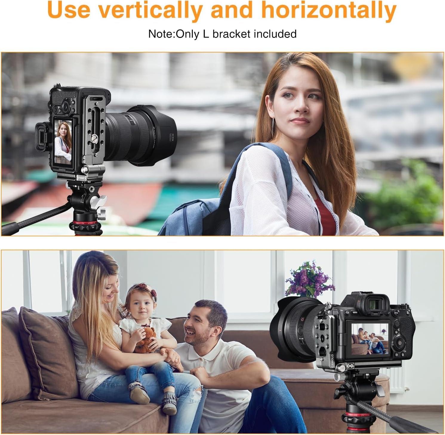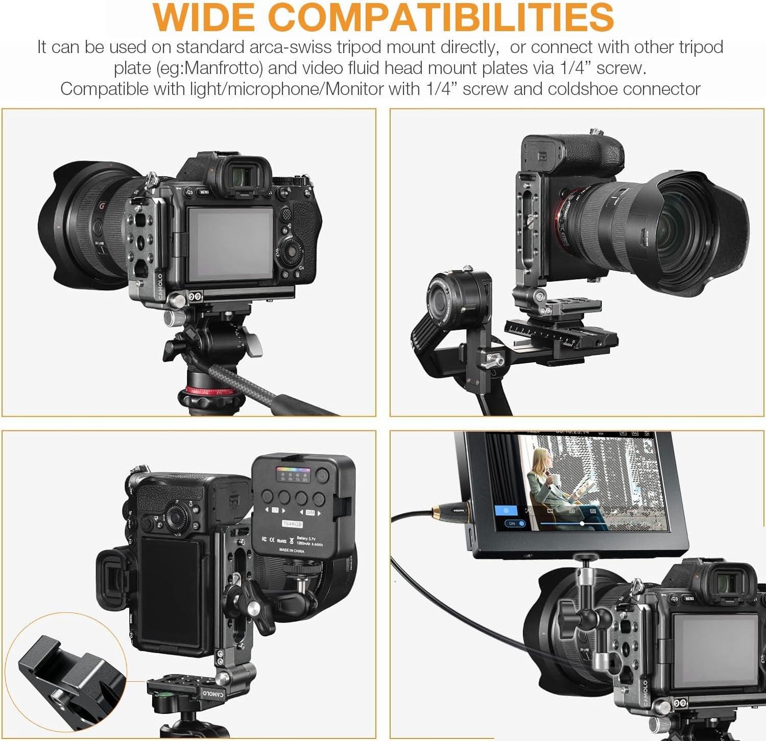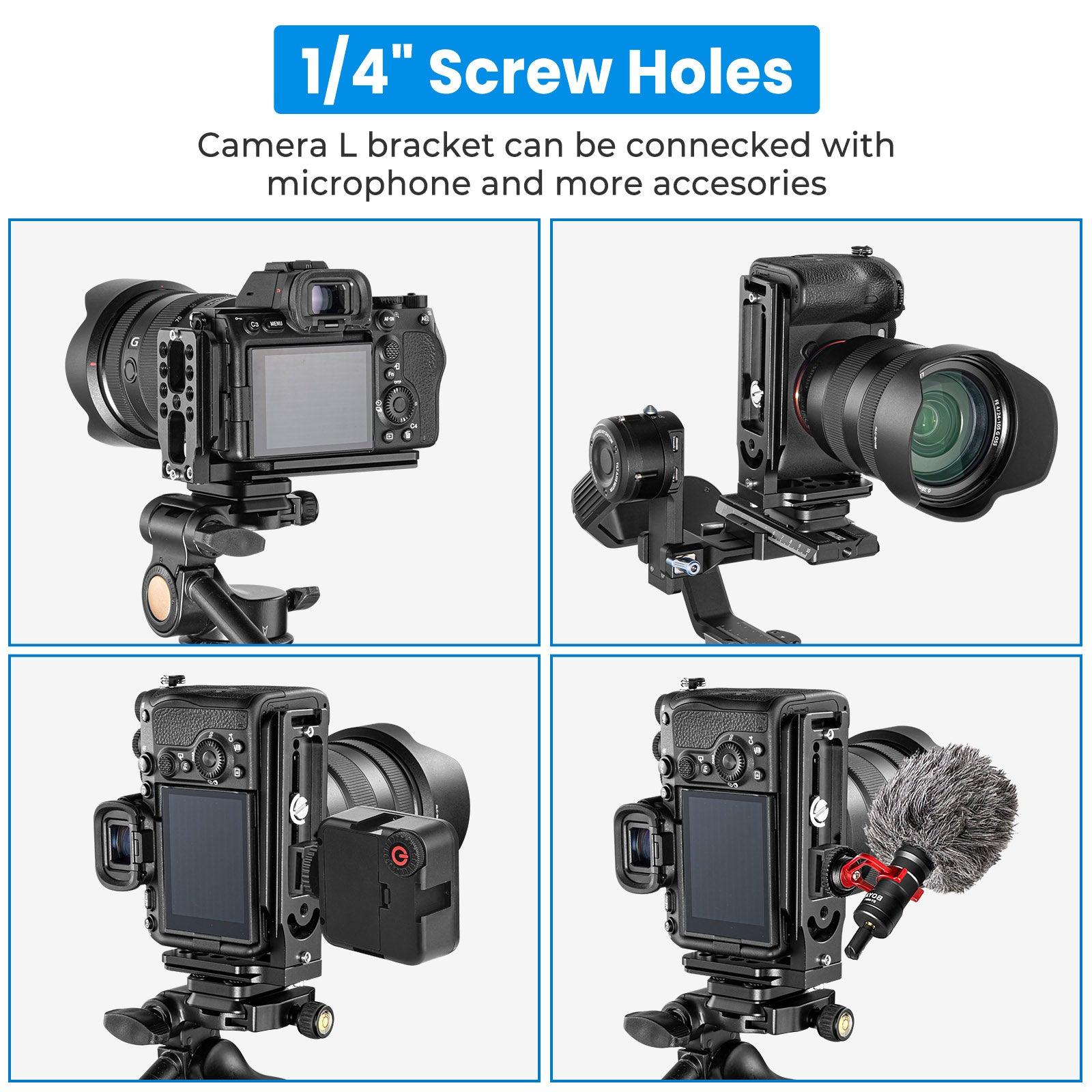 With 1/4' and 3/8' screws, this L bracket can be used on video tripod mount head such as Manfrotto and also gimbal stabilizer like DJI Zhiyun Smooth,Mirrorless Cameras