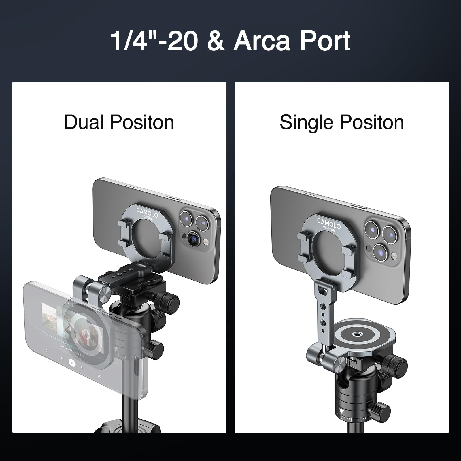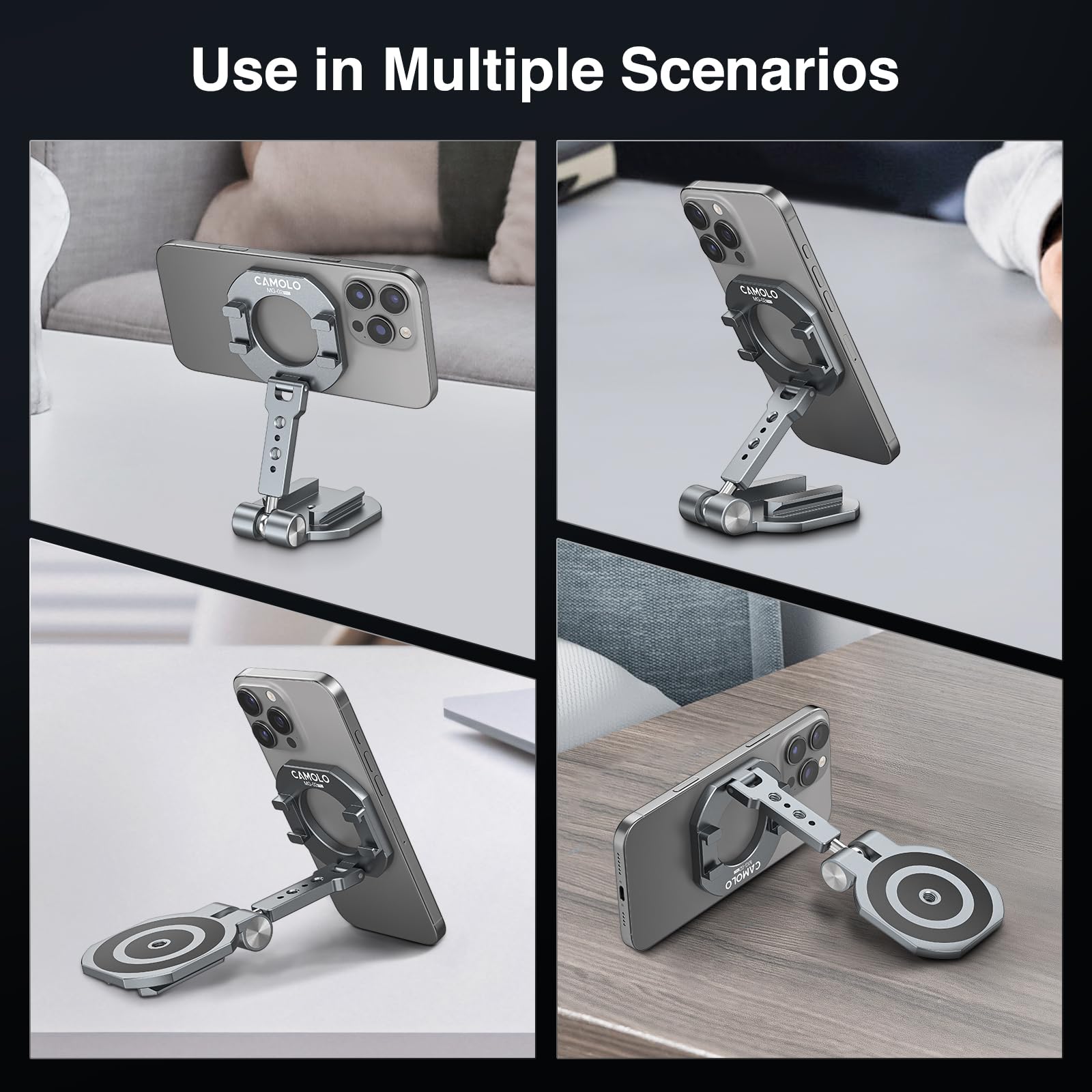 The CAMOLO Dual Magnetic Phone Holder is the perfect accessory for your Magsafe iPhone. Its high-powered magnets ensure a secure hold, while the 1/4" screw tripod mount allows for easy hands-free use. Whether at the gym or traveling, this versatile phone stand has got you covered.