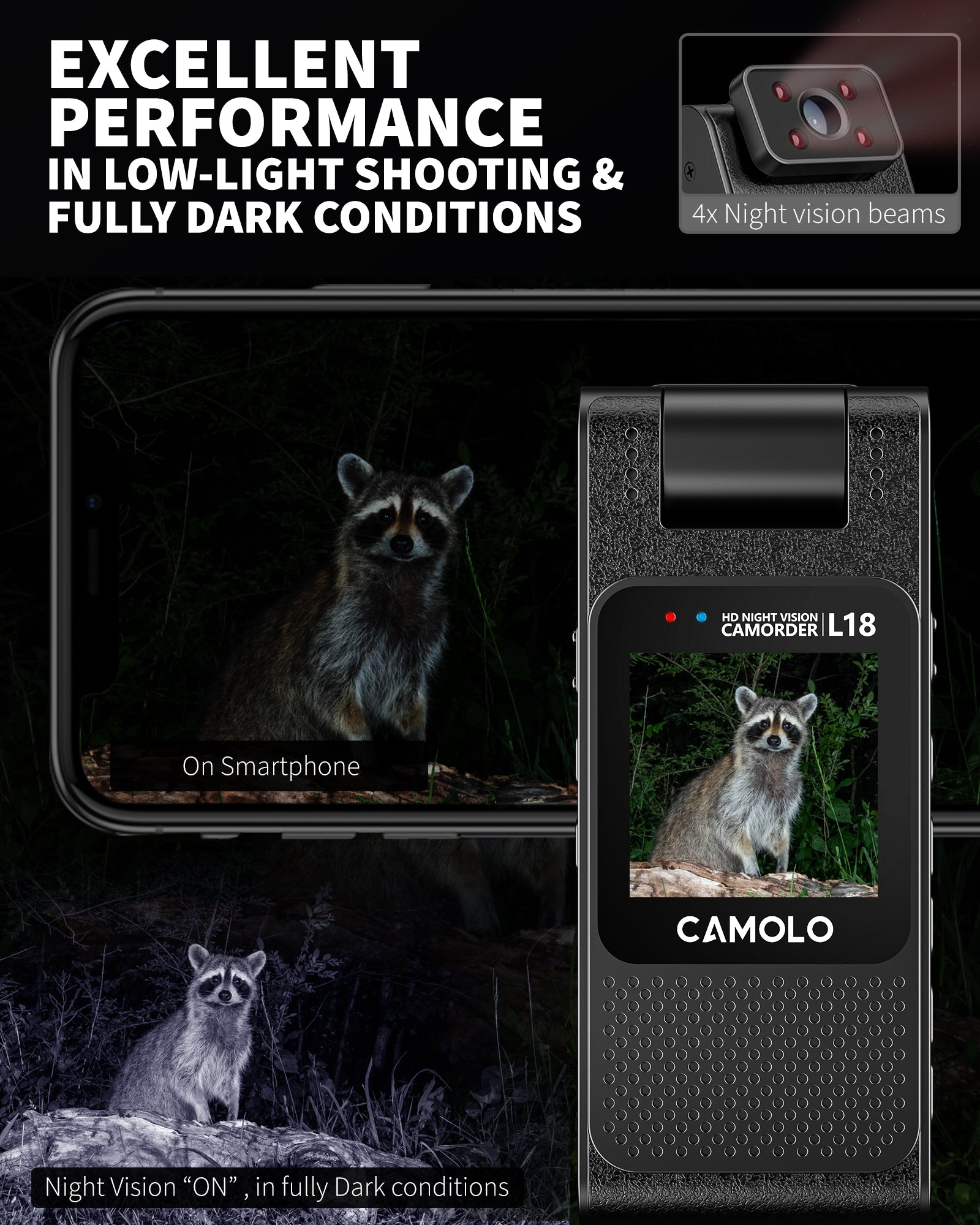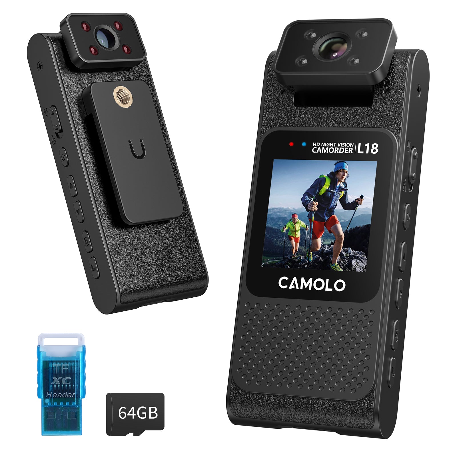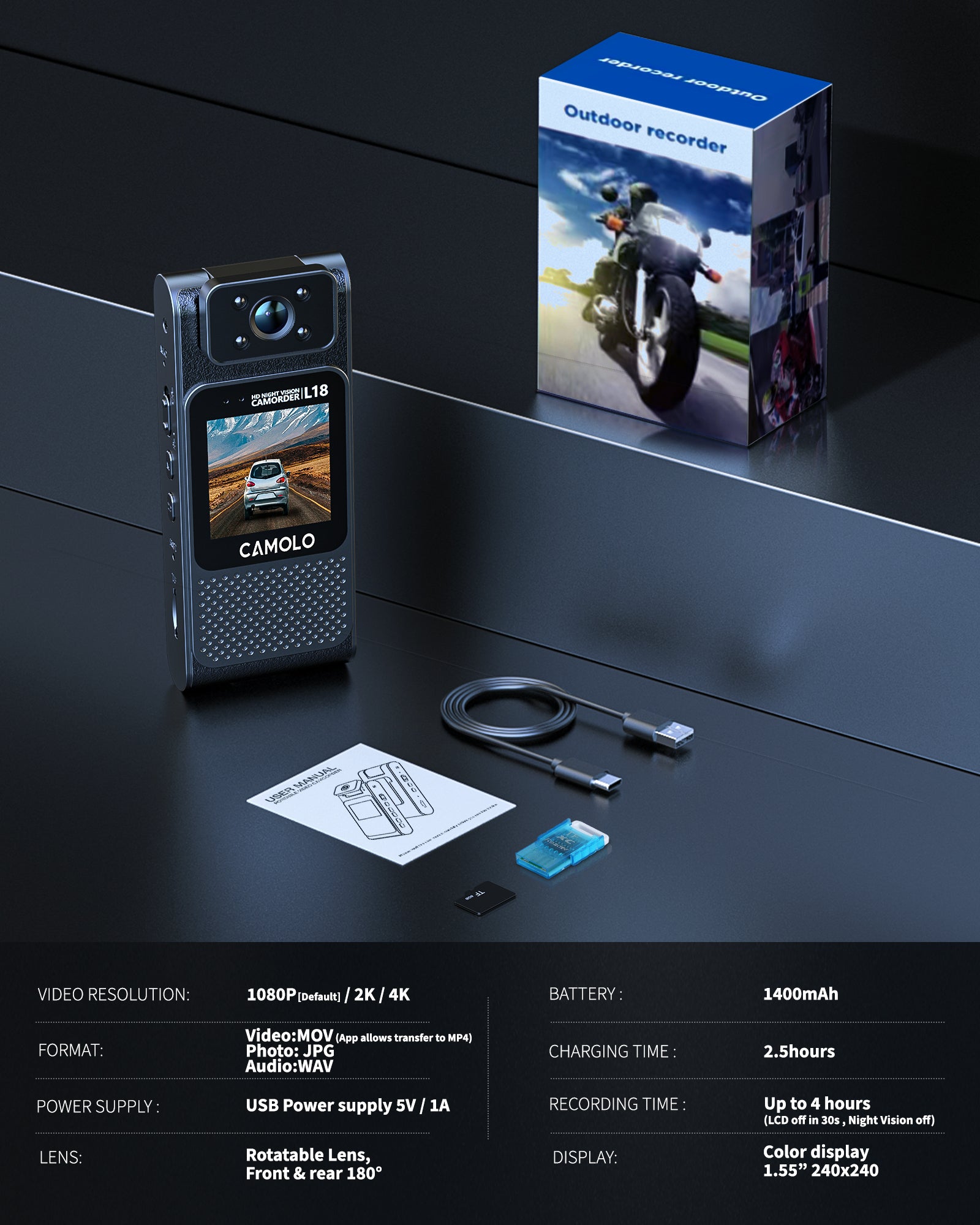 Capture every moment in bold, full HD with CAMOLO's action-packed flip lens video camera. With night vision capabilities, a 1.55" LCD screen, and 1400mAh battery, this camera is perfect for law enforcement, hiking, and sports. Stay connected with WIFI hotspot and store all your adventures with a 64GB storage card. Go beyond the ordinary with CAMOLO.