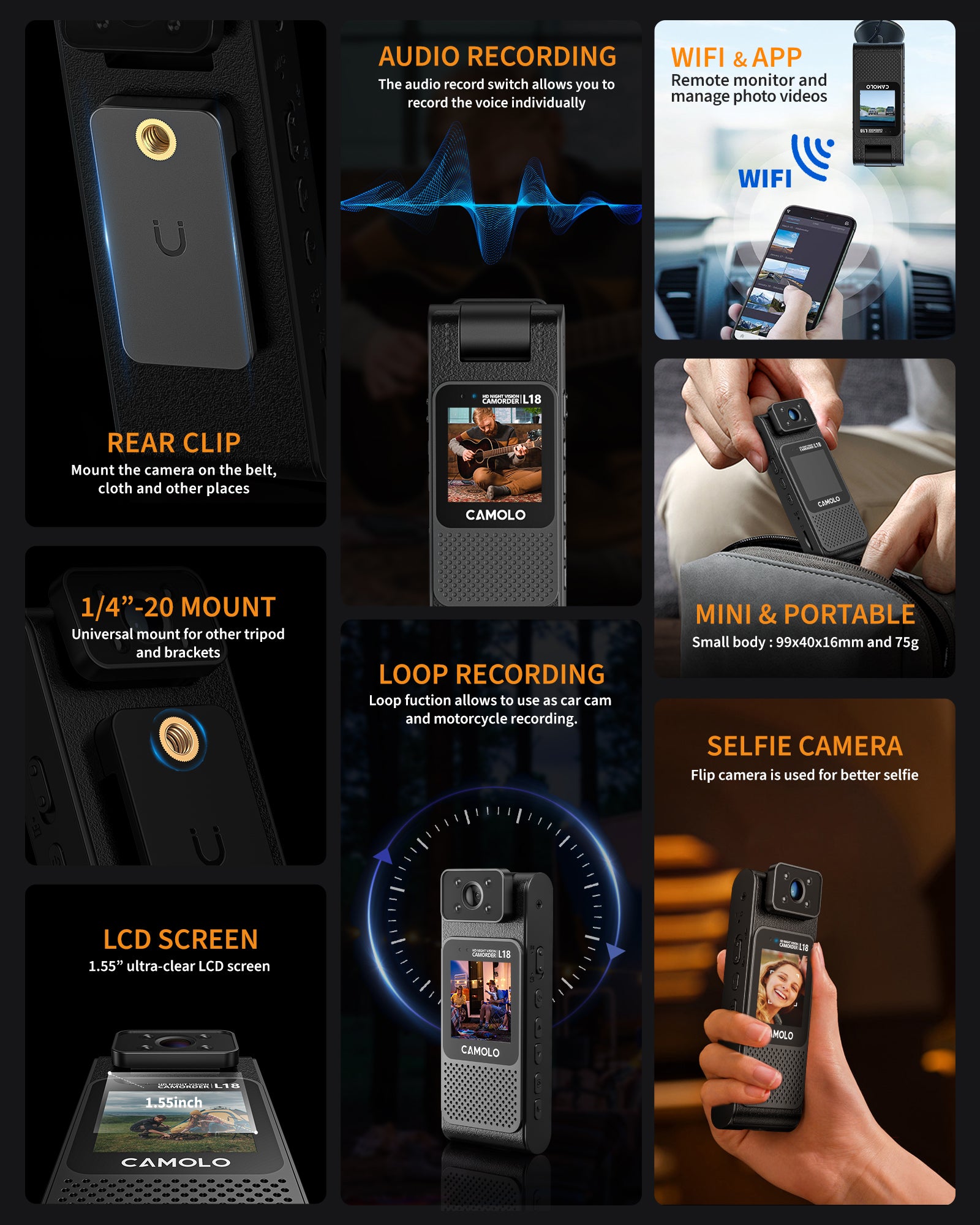 Individual Video / audio recording button allow one key launch. Rear clip with magnet and 1/4”-20 screw allow users to mount the camera on every places ( cloth/belt/iron surface/tripod/car mounts...) -