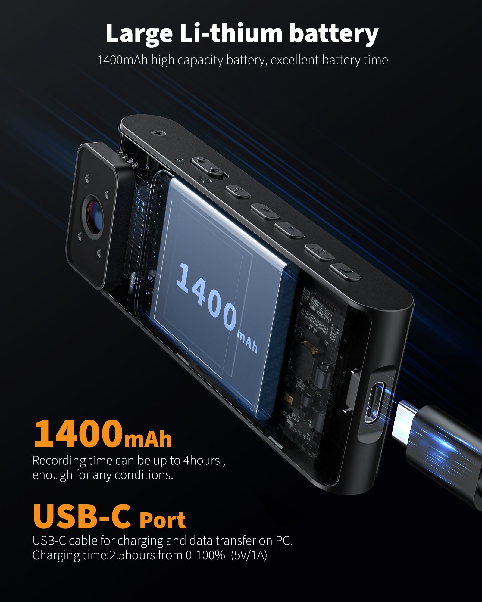 Built-in 1400mAh lithium battery provides up to 3hours non-stop or looping full HD recording, enough for one trip or one shift recording