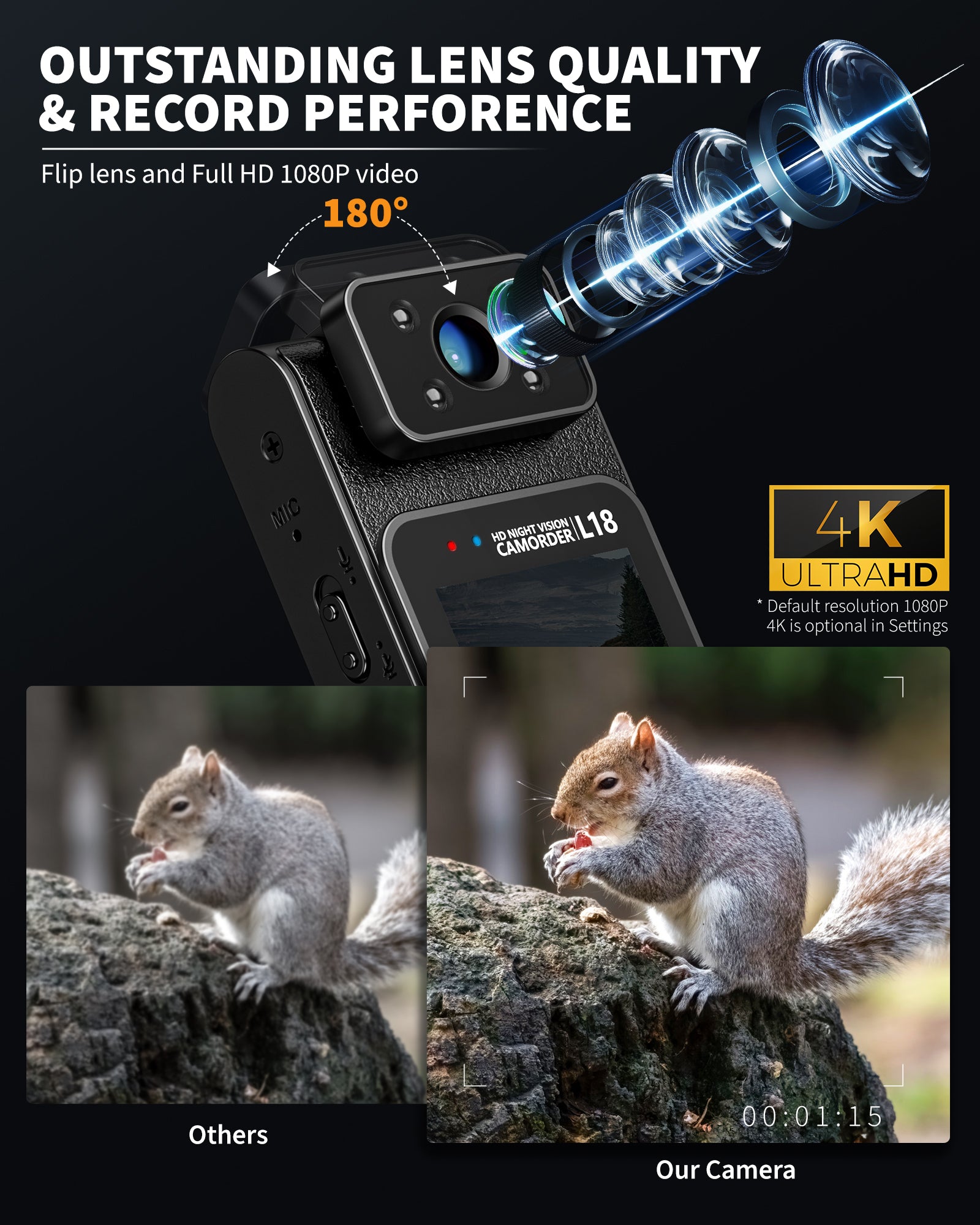 180°Rotatable Lens True HD 1080P optional UHD 4K in setting all could replay by the 1.55-inch High-quality LED Screen