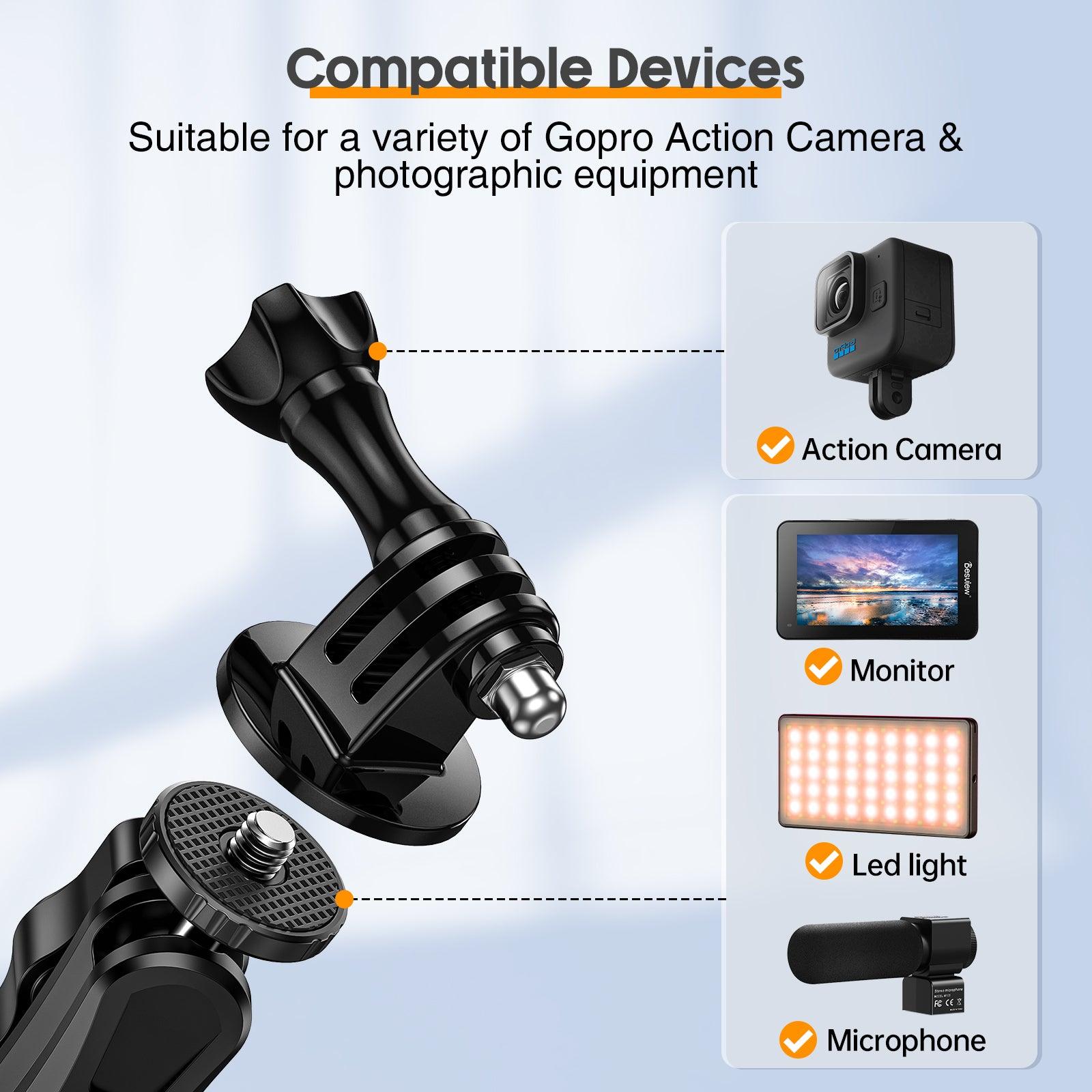 - 【Standard 1/4” and 3/8” Female Thread】1/4” and 3/8” female thread on the back-side of clamp help you to mount a small camera, monitor, LED video light, microphone, speedlite, and more. It is also compatible for gopro,is gopro triple camera mount adapter—Not included gopro adapter.